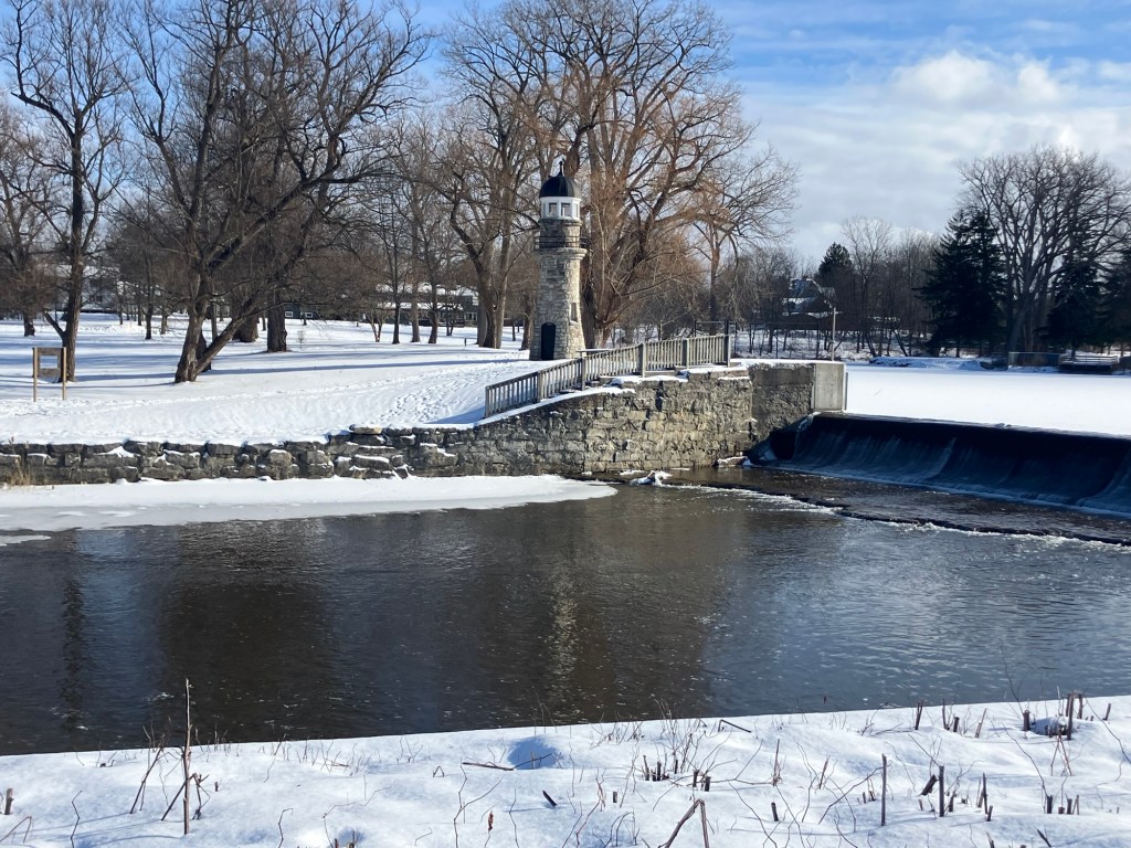 Intermittent lake views and snow-covered park paths