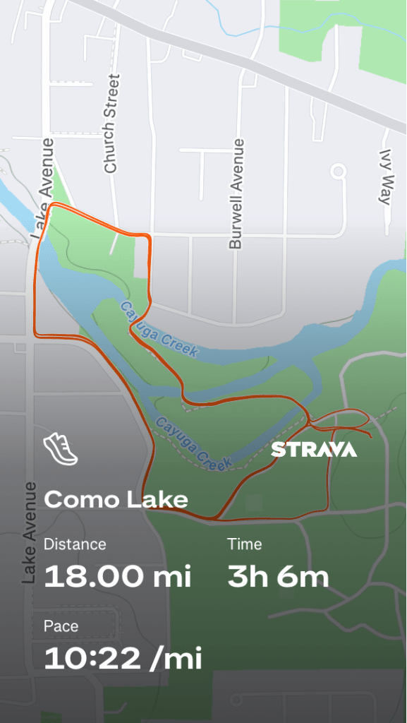 While the course does circle the lake, portions of route were on park trails and neighborhood streets, so lake views were intermittent rather than continuous. The repetition made it easy to settle into a steady rhythm and focus on a relaxed effort.
