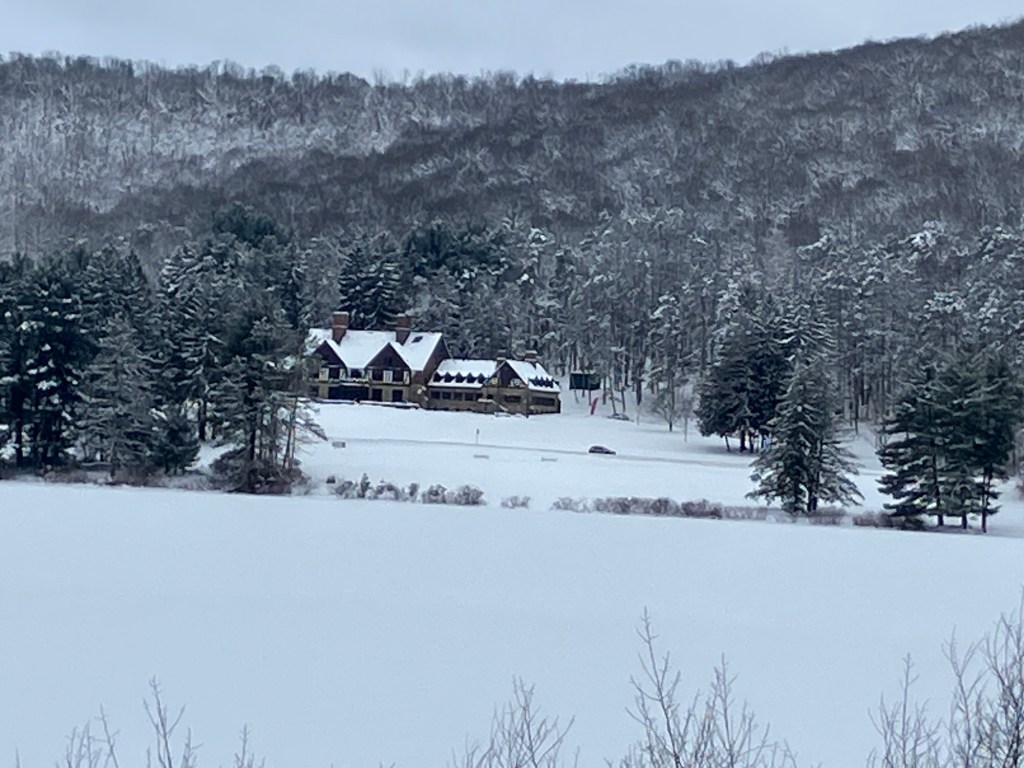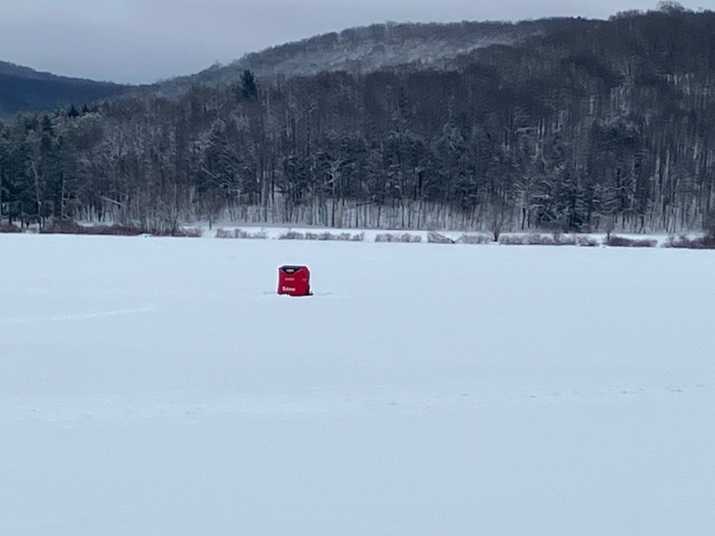 Snow-covered ground, frozen water, and a lot activity of around the lake. Even someone ice fishing on the lake! A winter park doing what winter parks do best.